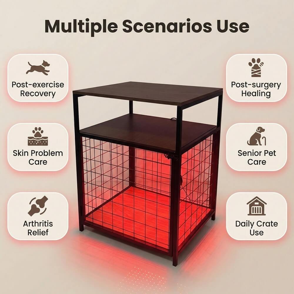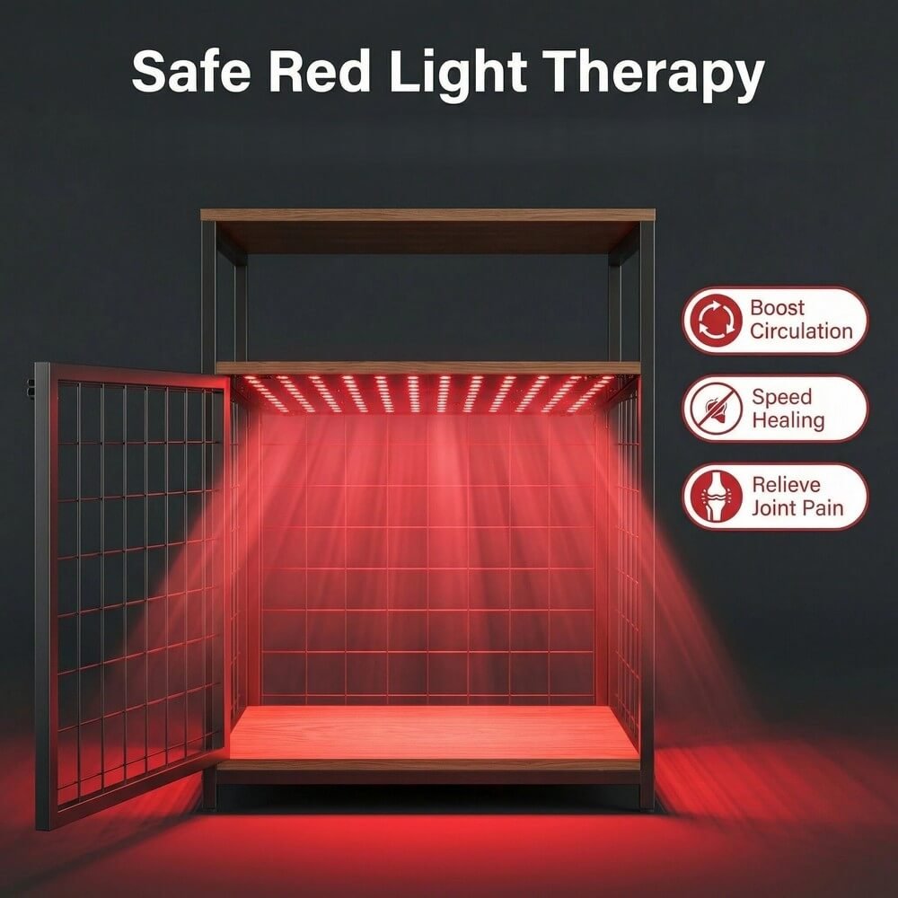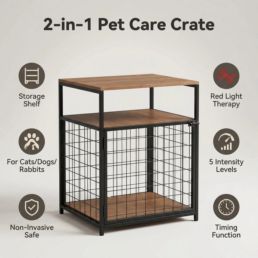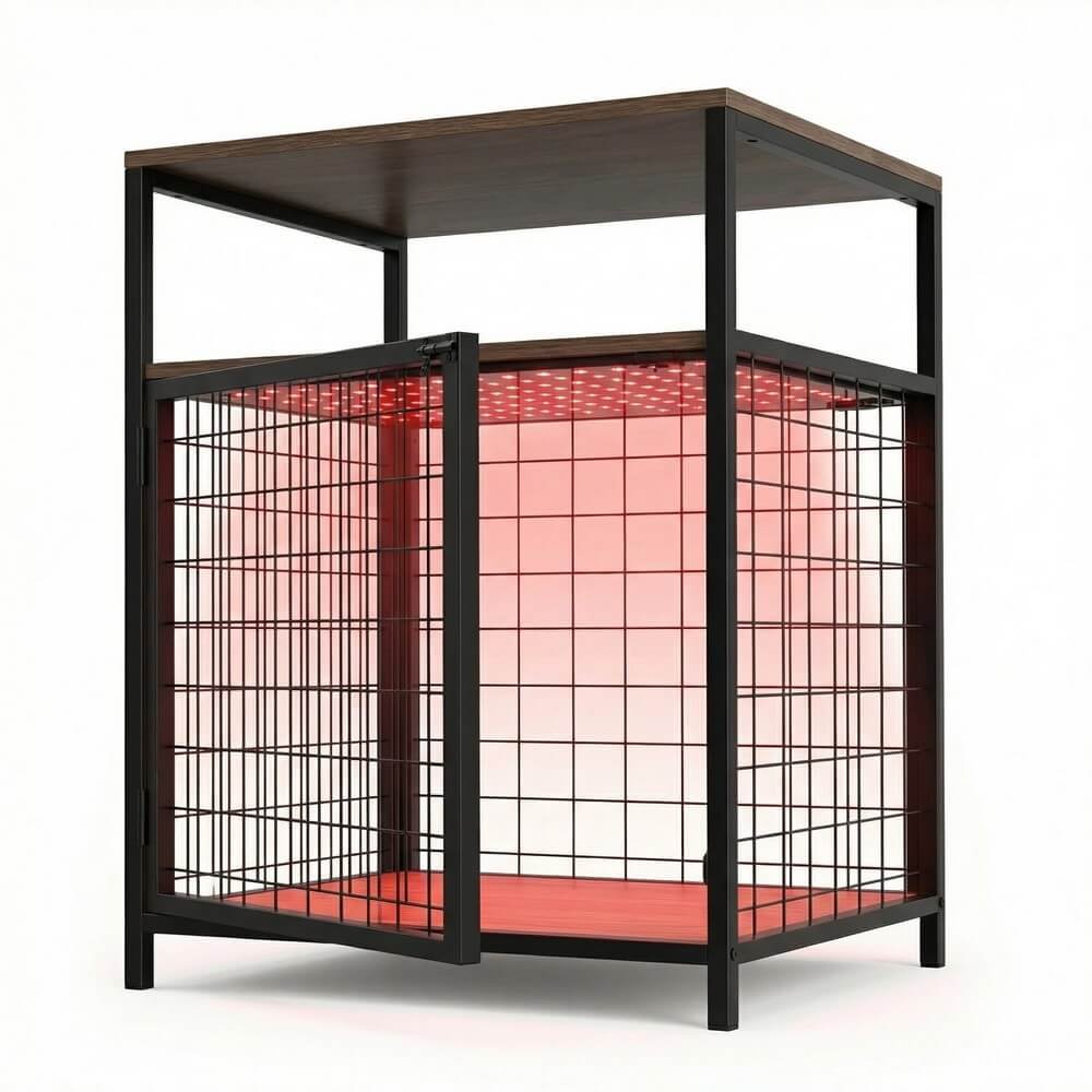 Non-invasive red light therapy cage designed for dogs & cats. Accelerate healing, reduce pain, and provide post-surgery care — all while blending into your home.